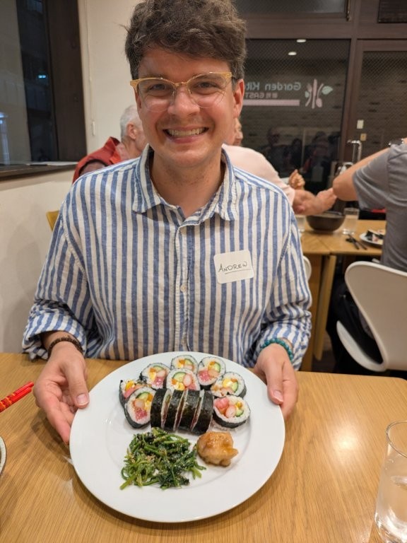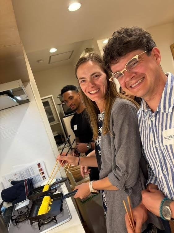 On the menu was sushi, teriyaki chicken, and spinach sesame salad. One of the parts of the sushi is Tamagoyaki, a rolled egg dish that I had been enjoying at the breakfast buffets in Hiroshima and Kyoto that also reminded me of a dish my mom made so it was nice to learn how to make that. I was frustrated at how good Andrews sushi turned out and how not sushi shaped mine turned out, but at least it still tasted amazing. I do think we’ll eventually try making forms of sushi when we get home although we have zero intention of cooking with raw fish.*